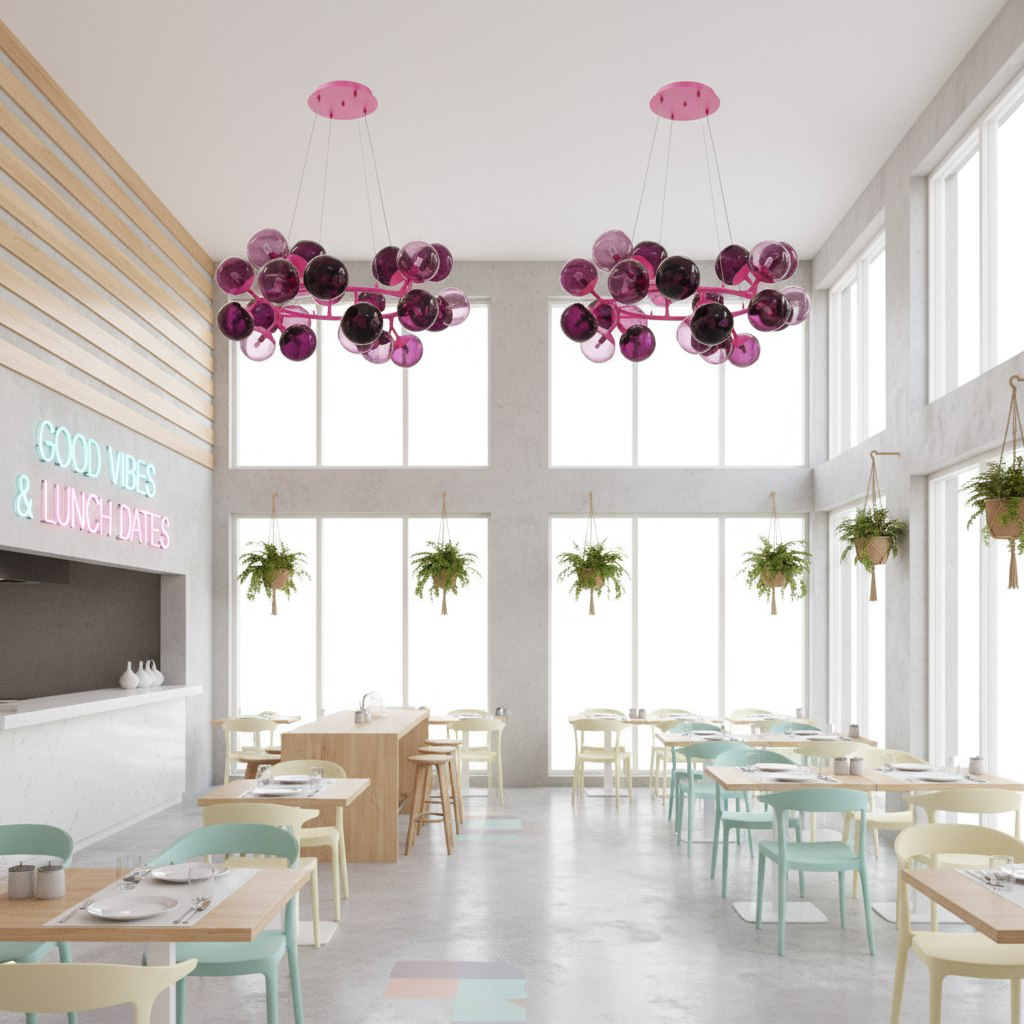 Этот интерьер будто создан для легкого начала дня, непринужденного общения и дружеских встреч — надпись на стене “Good vibes & lunch dates” говорит сама за себя. Люстра Wild Grape органично продолжает эту концепцию. Её форма, вдохновлена гроздьями спелого винограда, где каждый плафон – это отдельный плод.